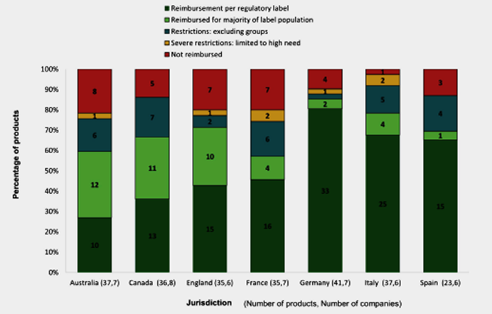 Un estudio de Wang et al.[20] demostró que 8 de las agencias más importantes del mundo poseen una tasa de rechazo de financiamiento de nuevas tecnologías que no supera el 20%. Es decir 8 de cada 10 tecnologías presentadas son aprobadas parcial o totalmente para su cobertura.